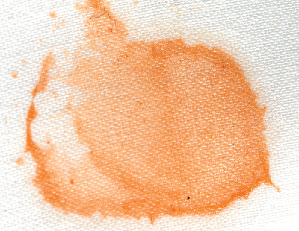 Das Ausspülen roter Flecken durch Tomaten u. Ä. mit kaltem klarem Wasser, Essigwasser und kohlesäurehaltigem Mineralwasser oder das Austupfen mit Waschbenzin mildert die Flecken zwar etwas ab, wird aber immer Restflecken hinterlassen. Der rote Tomatenfarbstoff Lycopin setzt sich genauso schnell äußerst hartnäckig im Gewebe fest, wie das kräftig-rote Betanin der Roten Beete. Tomatensoßen enthalten zudem meist Fett und Öl, die in Stoffgeweben zu hartnäckigen Flecken führen. Ist z. B. die heißgeliebte Spaghetti-Tomatensoße auf dem Hemd oder Shirt gelandet, Soßenmasse sofort mit einem Messer vorsichtig abstreifen, ohne den Fleck dabei zu vergrößern. Auch für Senf und Ketchup gilt: Überschüssige Masse sofort abnehmen.