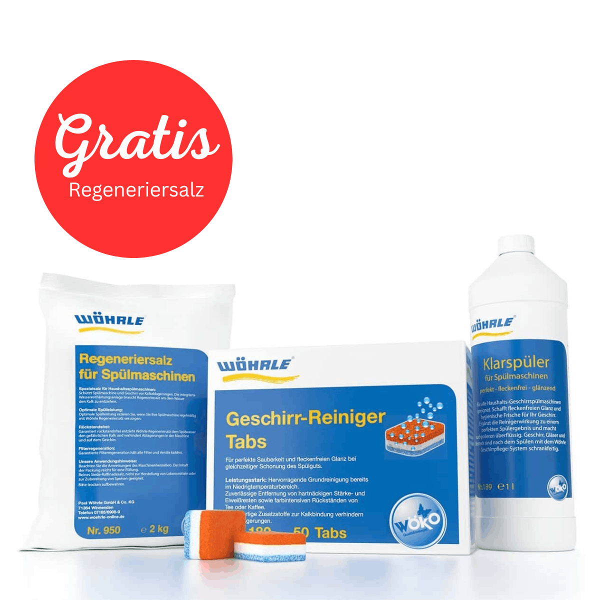 Beim Kauf des WÖHRLE Spülsystems Tabs erhalten Sie das Regeneriersals kostenlos dazu. Im Vergleich zum Kauf der einzelnen Produkte sparen Sie somit 3,75 €.